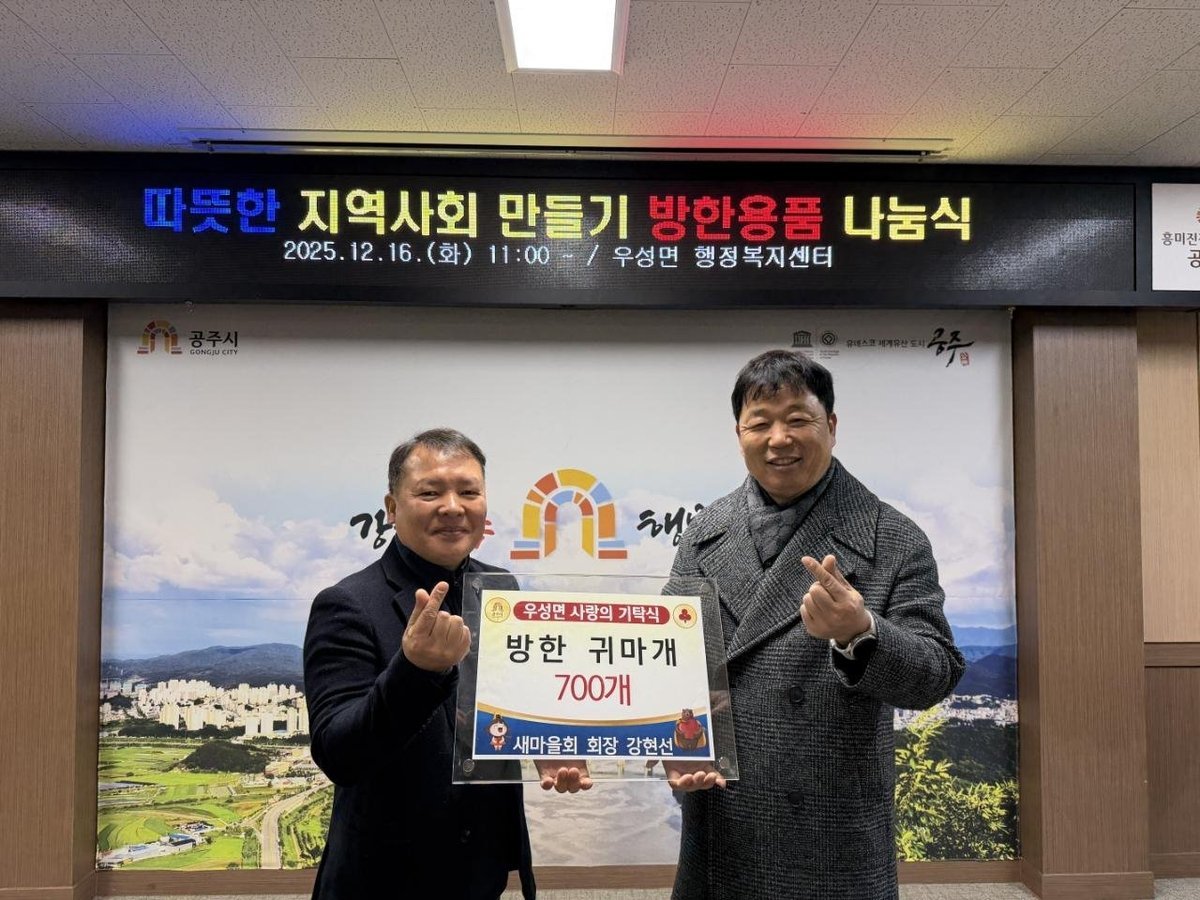 이용건 우성면장은 “겨울철 추위에 특히 취약한 어르신들을 위해 따뜻한 마음을 전해 주신 새마을협의회에 감사드린다”며 “앞으로도 지역 단체와 긴밀히 협력해 주민 복지 향상을 위해 더욱 힘쓰겠다”고 밝혔다.