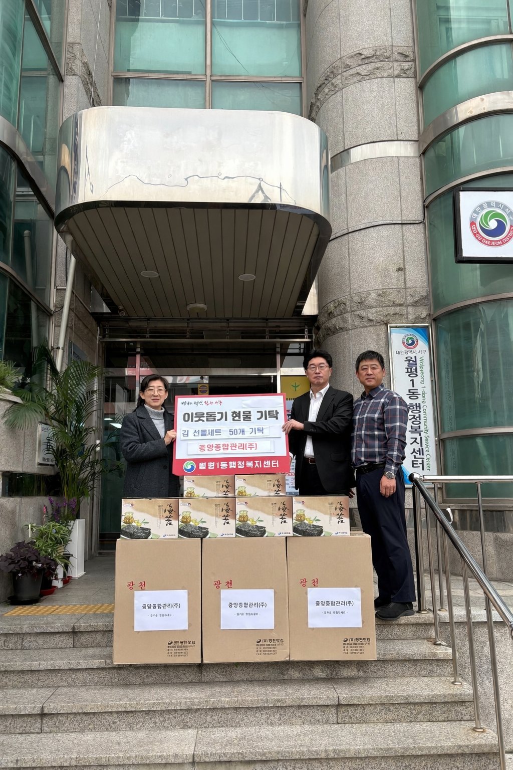 [세종타임즈] 대전 서구 월평1동 행정복지센터는 중앙종합관리로부터 김 선물 세트 50개를 기탁받았다고 17일 전했다.