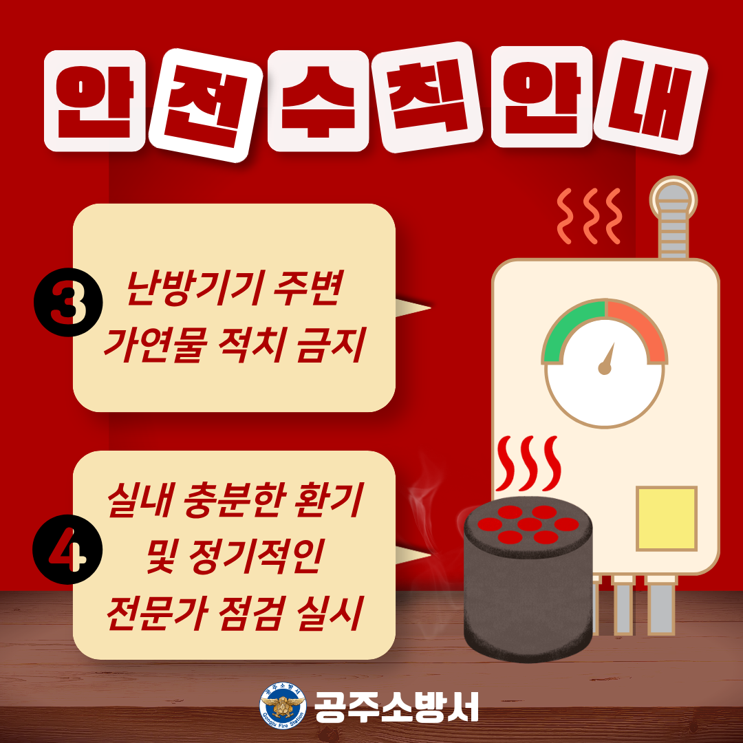 공주소방서는 안전사고 예방을 위해 연료 저장 용기의 손상 여부와 누유 상태를 수시로 점검하고, 보일러와 배관의 노후·부식 여부를 확인할 것을 강조했다.