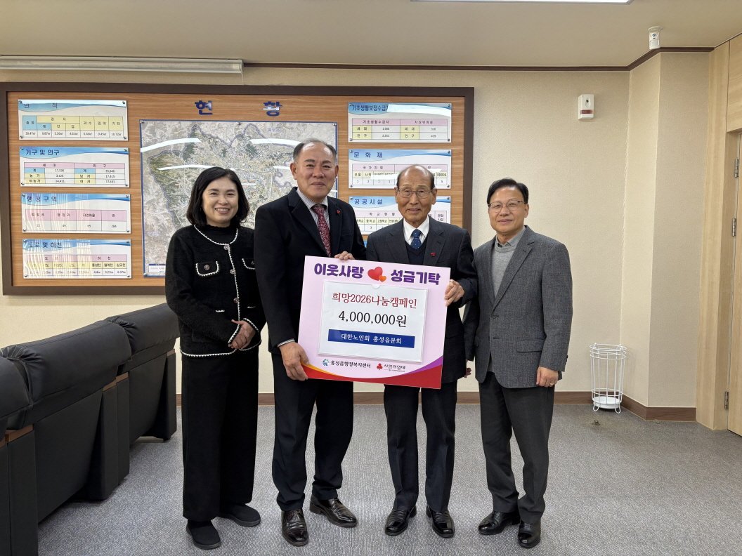 [세종타임즈] 대한노인회 홍성읍분회는 지난 17일 홍성읍 행정복지센터를 방문해 ‘희망2026 이웃돕기 성금’으로 400만 원을 기탁하며 지역사회에 따뜻한 나눔을 실천했다.