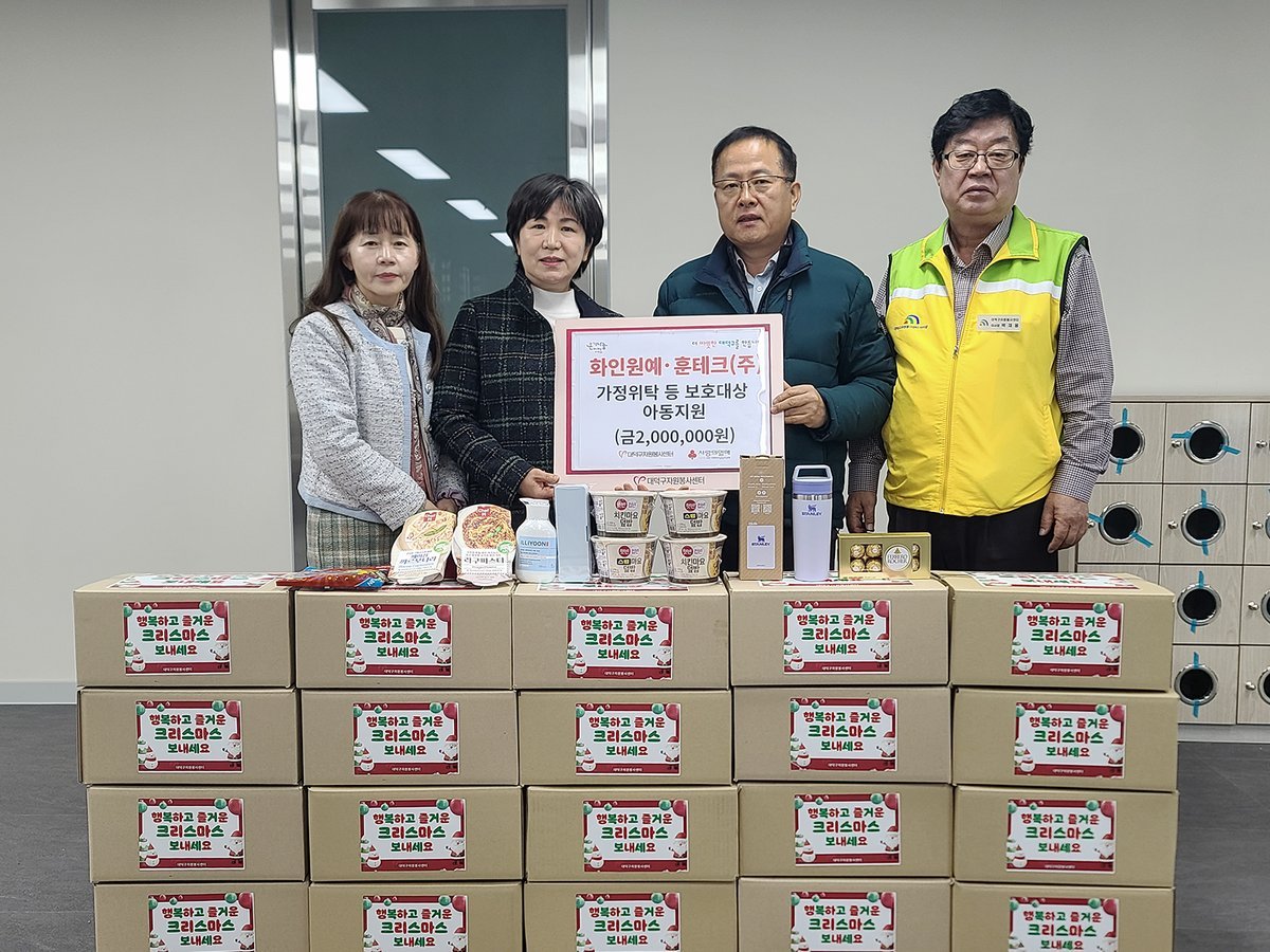 최충규 대덕구청장은 “우리 지역의 아이들을 위해 따뜻한 나눔을 실천해주신 훈테크와 화인원예에 깊이 감사드린다”며 “대덕구도 도움이 필요한 아이들이 건강하게 성장할 수 있도록 촘촘한 지원체계를 구축해 나가겠다”고 전했다.