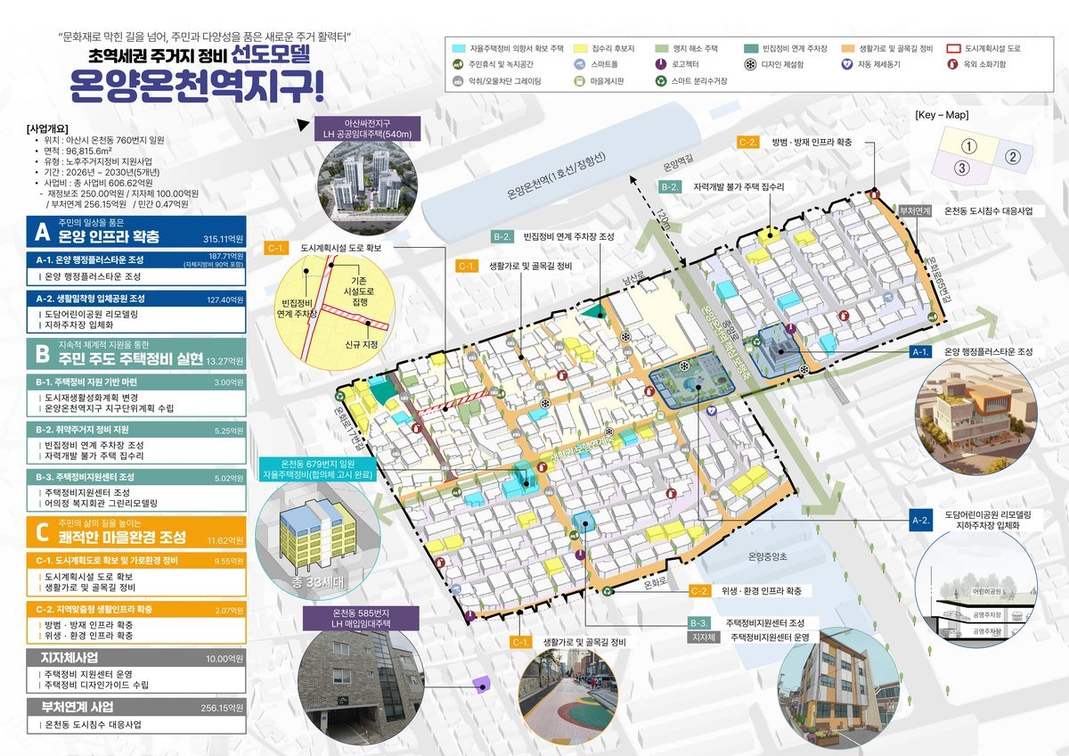 주요 사업 내용은 △온양 행정플러스타운 조성 △공영주차장 조성 △생활밀착형 입체공원 조성 △주택정비 지원 기반 마련 △취약주거지 정비 지원 △주택정비지원센터 조성 △도시계획도로 확보 및 가로환경 정비 △지역 맞춤형 생활 인프라 확충 등이다.