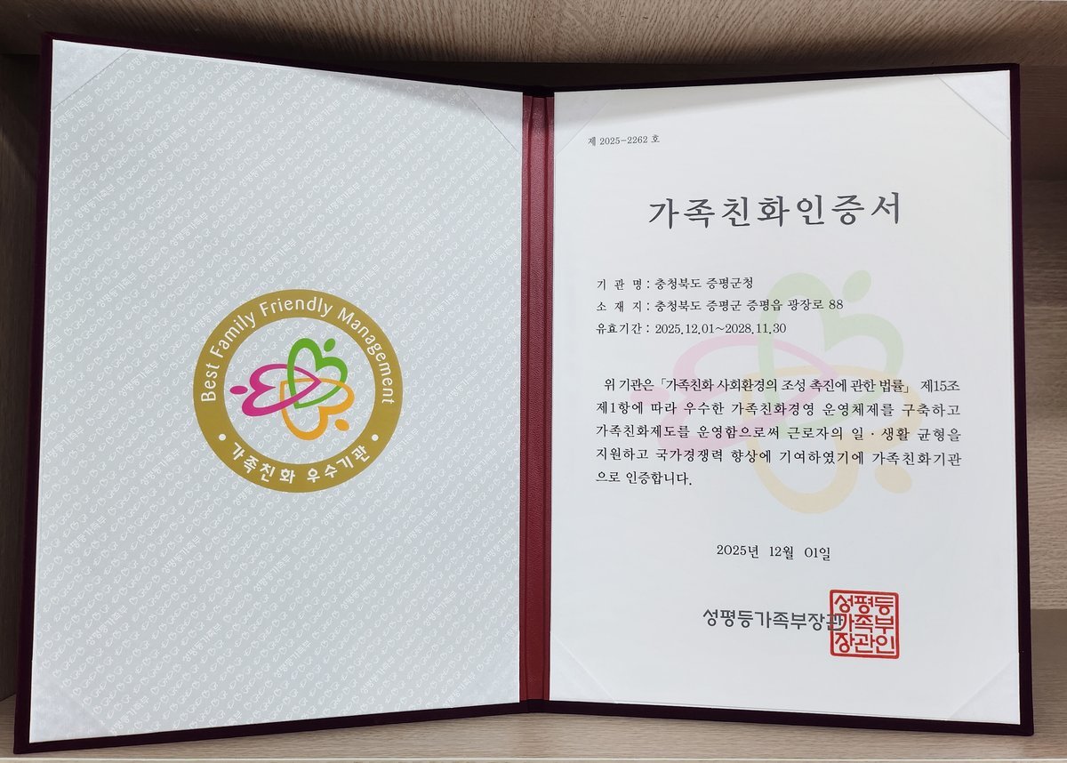 증평군은 2014년 첫 가족친화인증을 획득한 이후 2017년, 2019년, 2022년 재인증을 거쳐 올해 또다시 재인증을 받아 2028년 11월까지 3년간 자격을 유지하게 됐다.