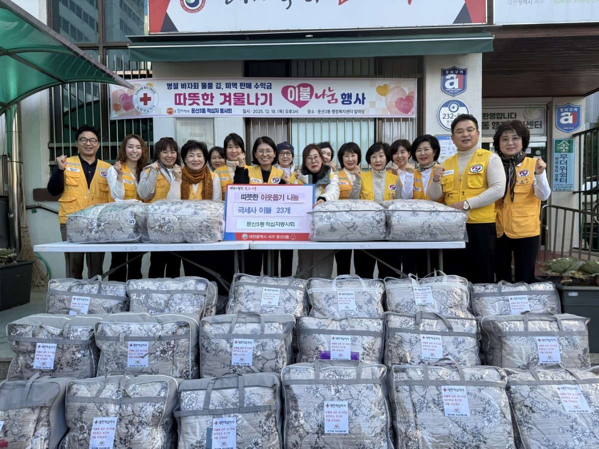 백승래 둔산3동 적십자봉사회 회장은 “회원들이 정성껏 마련한 수익금으로 이웃들에게 따뜻한 이불을 전할 수 있어 뜻깊다”며 “앞으로도 지역사회 나눔 실천에 앞장서겠다”고 말했다.