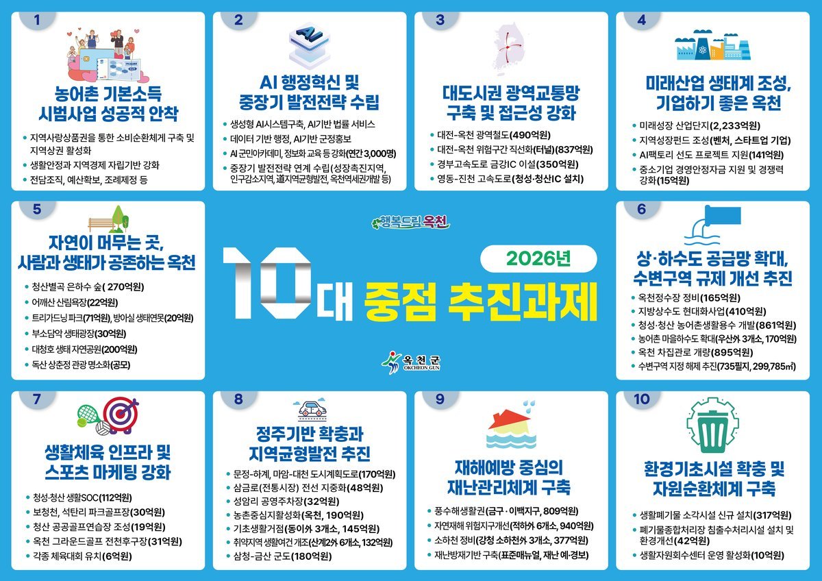 [세종타임즈] 옥천군이 26일 2026년 군정 운영의 핵심 방향을 담은 10대 중점 추진과제를 발표하고, 군민 삶의 질 향상과 지속가능한 지역성장을 위한 정책 추진에 나선다.