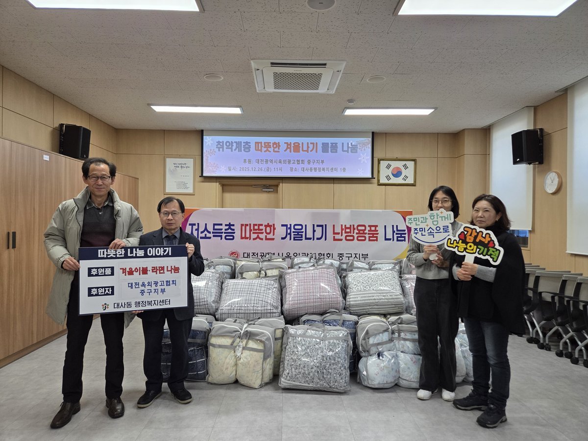 유재경 동장은“어려운 이웃을 위해 이불과 라면을 지원해주신 대전옥외광고협회 중부지부 회원분들의 정성에 감사드리며, 기탁해주신 물품은 필요한 분들에게 잘 전달하겠다”라고 답했다.