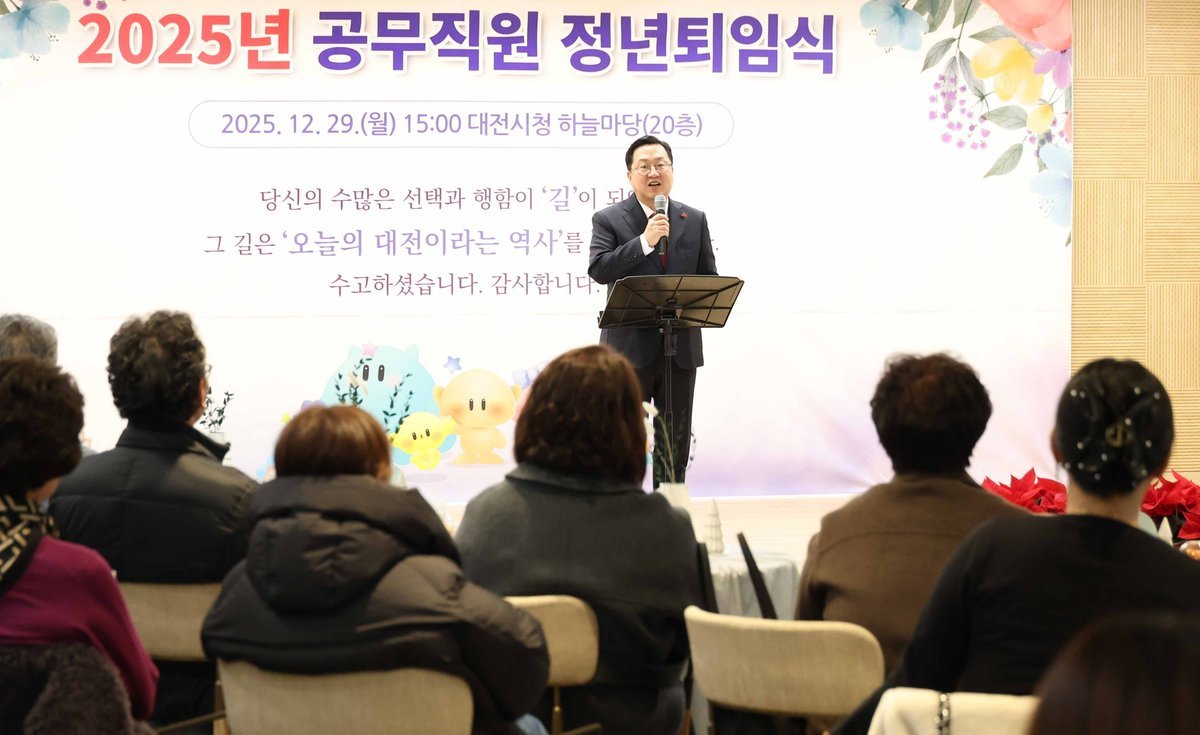 [세종타임즈] 대전시는 29일 시청 하늘마당에서 정년퇴직 공무직원, 가족, 동료 직원 등 50여 명이 참석한 가운데 ‘2025년 공무직원 정년퇴임식’을 개최했다.