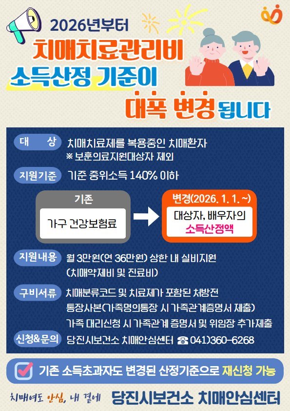 [세종타임즈] 당진시보건소 치매안심센터는 2026년 1월 1일부터 치매치료관리비 지원사업의 소득 기준 산정 방법이 변경된다고 31일 밝혔다.