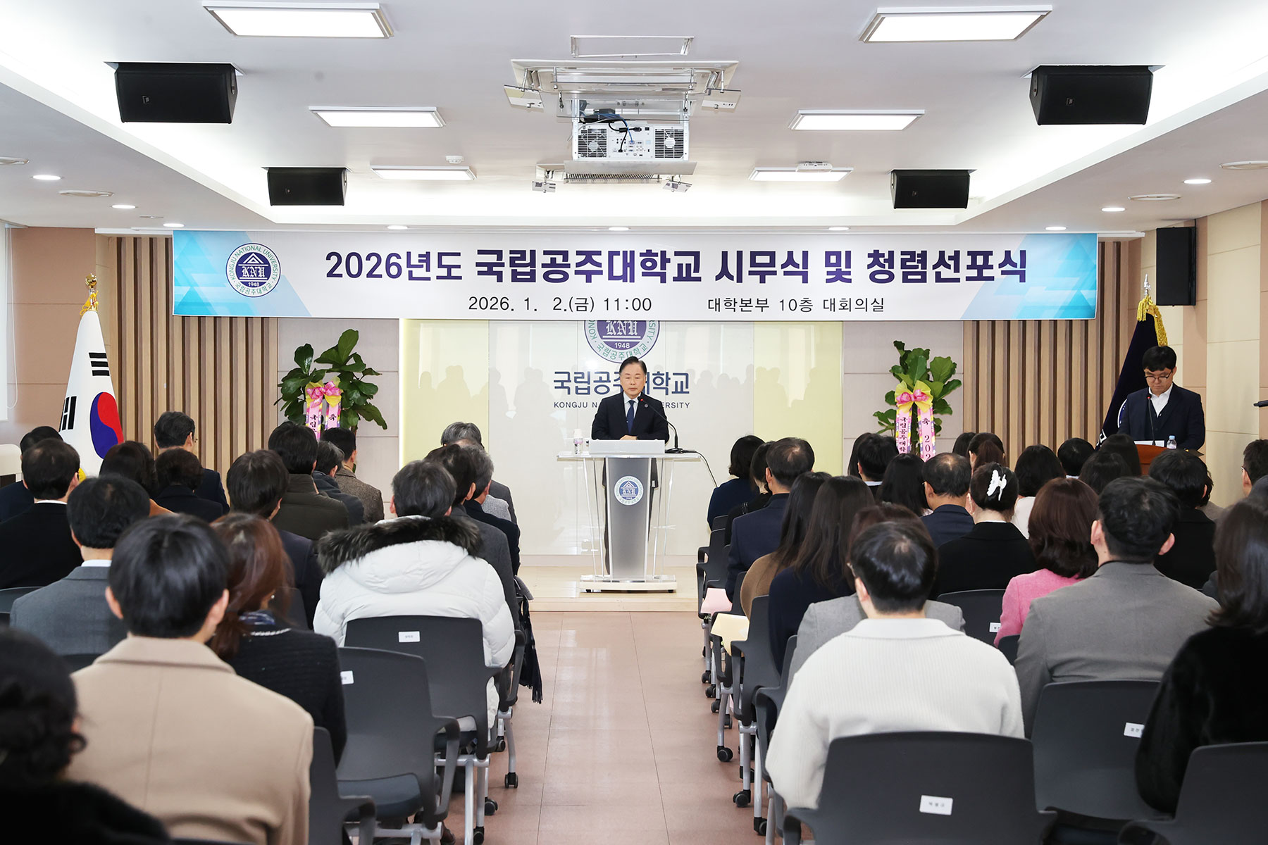 [세종타임즈] 국립공주대학교는 2일 대학본부 대회의실에서 2026년도 시무식 및 청렴선포식을 열고 새해 힘찬 출발을 알렸다.