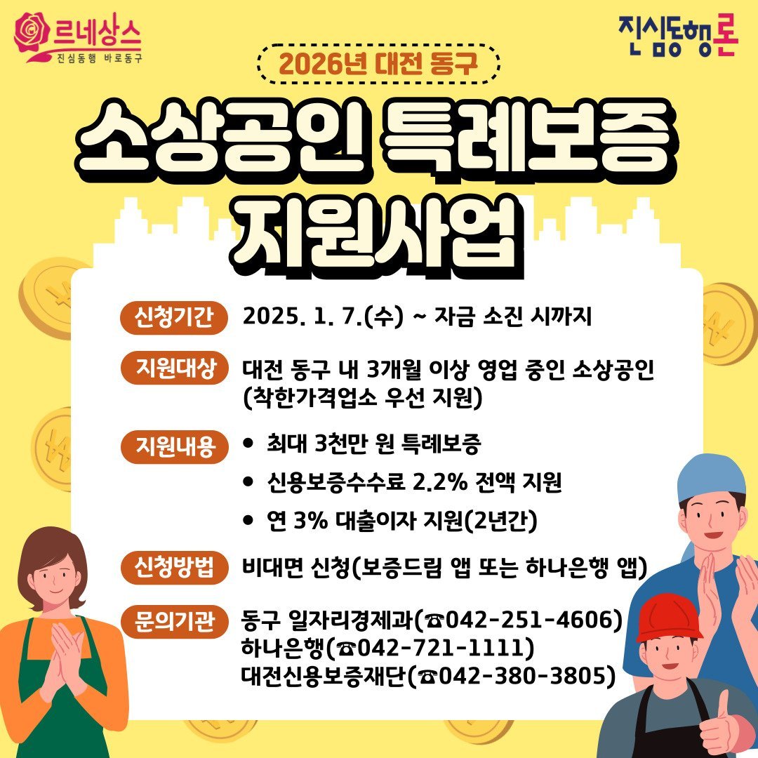 [세종타임즈] 대전 동구는 경기 침체와 고금리 기조로 경영에 어려움을 겪고 있는 지역 소상공인을 지원하기 위해 '2026년 소상공인 특례보증 지원사업'을 본격 시행한다고 6일 밝혔다.