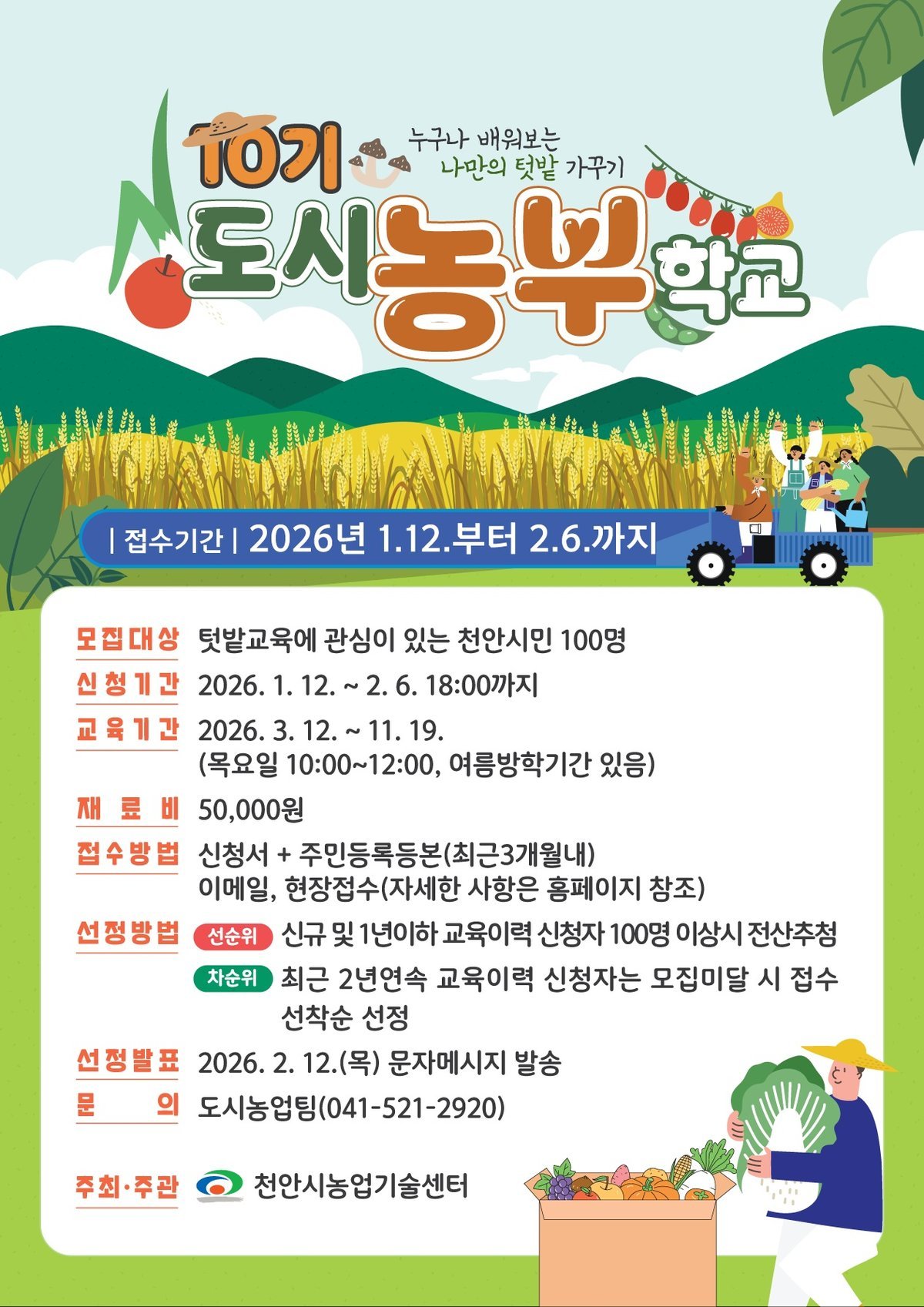 [세종타임즈] 천안시농업기술센터는 오는 12일~ 내달 6일 ‘천안도시농부학교 10기 교육생’을 모집한다고 8일 밝혔다.