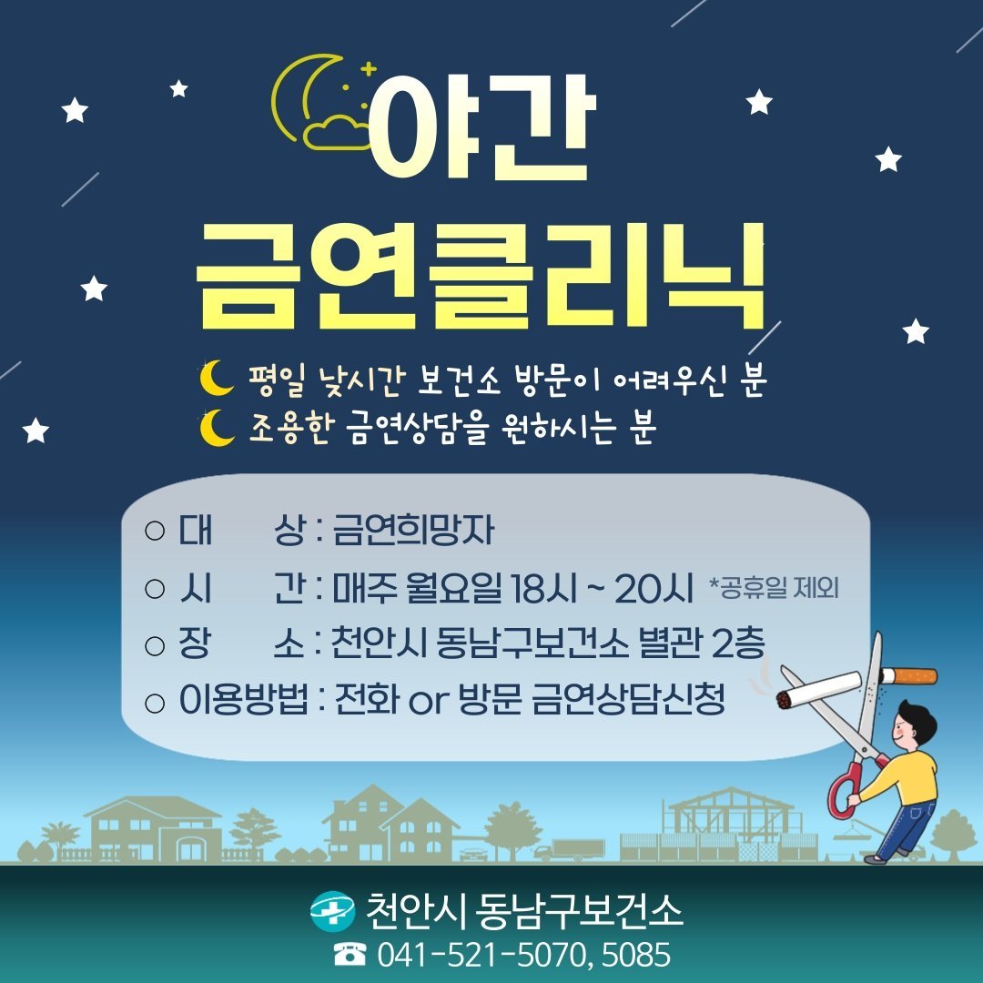 [세종타임즈] 천안시 동남구보건소는 새해를 맞아 오는 11월까지 야간 금연클리닉을 운영한다고 8일 밝혔다.