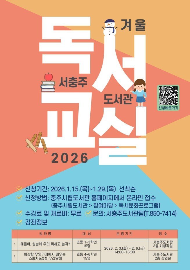 참가 신청은 2026년 1월 15일부터 29일까지 사흘간 충주시립도서관 누리집을 통해 선착순으로 접수하며, 수강 대상자는 1월 30일 개별 안내할 예정이다.