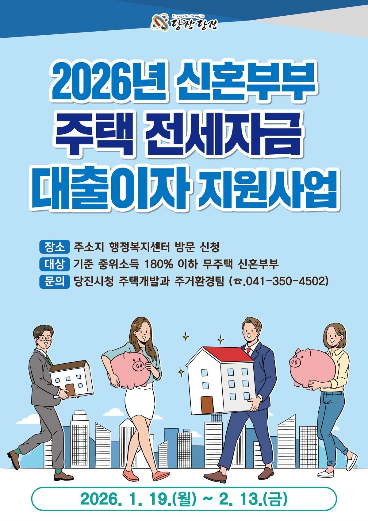 [세종타임즈] 당진시는 1월 19일부터 2월 13일까지 ‘2026년 신혼부부 주택 전세자금 대출이자 지원사업’신청자를 모집한다고 16일 밝혔다.