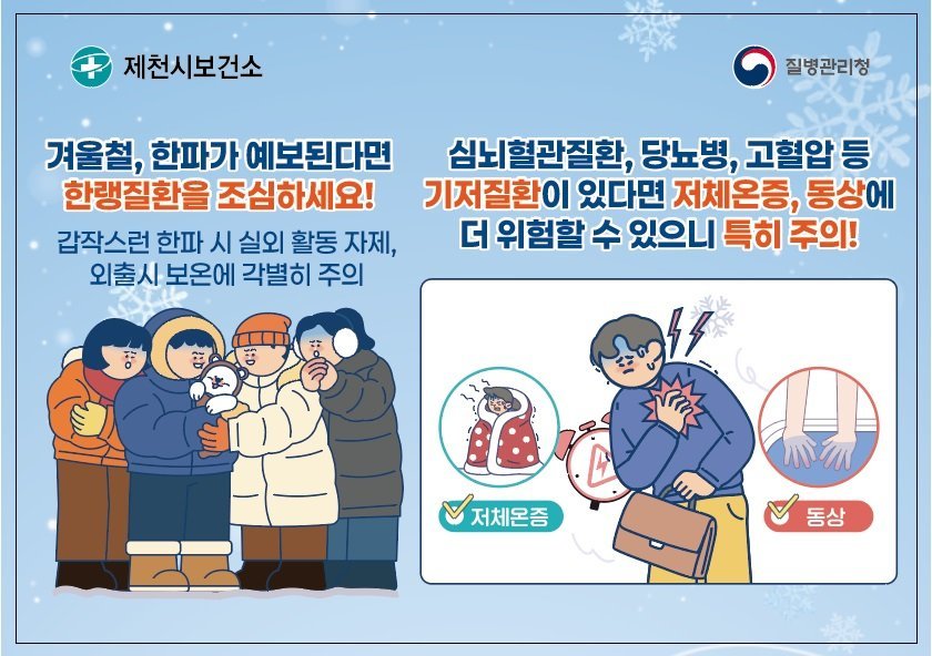[세종타임즈] 제천시보건소가 겨울철 한파로 인한 건강 피해를 예방하기 위해 독거 어르신, 만성질환자, 거동 불편자 등 건강 취약계층을 대상으로 집중 건강관리를 추진한다.
