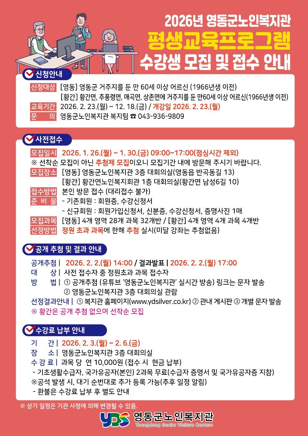영동은 신청 인원이 모집 정원을 초과할 경우 추첨제로 수강생을 선발하며 공개 추첨은 2월 2일 오후 2시, 유튜브 ‘영동군노인복지관’채널을 통해 실시간으로 중계될 예정이다.