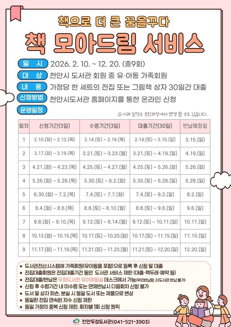 참여를 희망하는 가정은 천안시도서관 누리집을 통해 온라인으로 신청하면 된다.