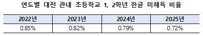 분석 결과에 따르면, 2025학년도 대전 관 내 초등 1, 2학년 한글 미해득 학생 비율은 0.72%로 나타났다.