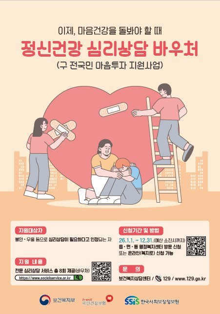 '정신건강 심리상담 바우처 사업'은 기존 '전 국민 마음투자 지원사업'을 새롭게 개편해, 심리상담이 필요하다고 인정되는 대상자에게 전문 심리상담 서비스를 바우처 형태로 지원하는 사업이다.