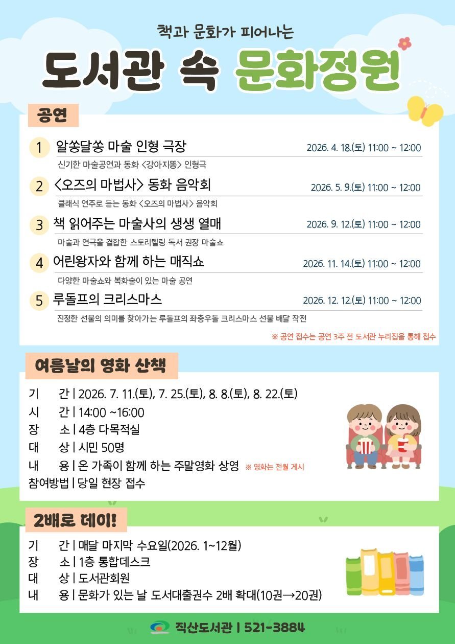 직산도서관 관계자는 “전 연령이 함께 즐길 수 있는 다양한 문화 프로그램을 마련했다”며 “책과 문화가 어우러진 문화 프로그램을 통해 도서관이 지역주민에게 즐거움과 휴식을 주는 문화 공간이 되기를 바란다”고 말했다.