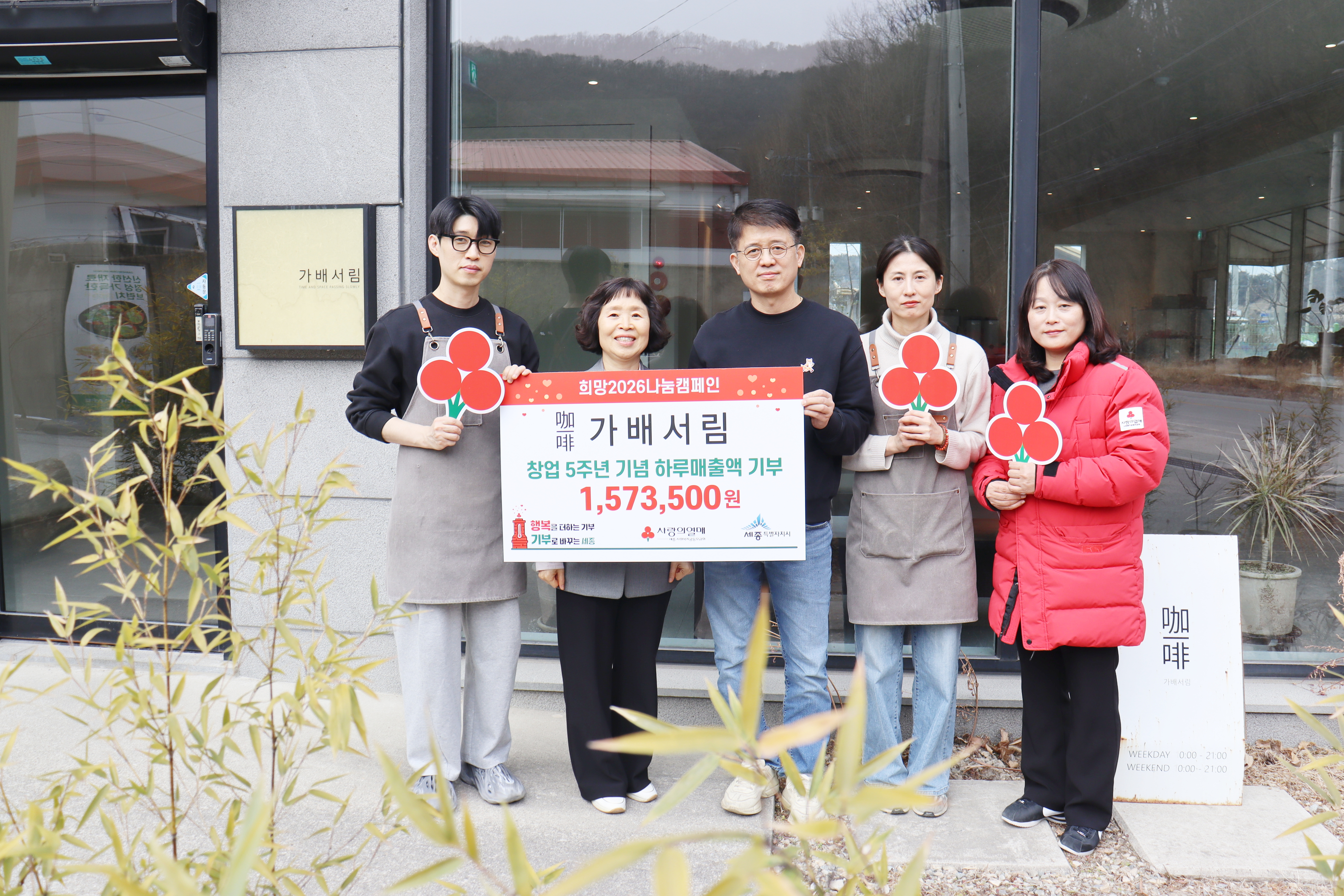 세종사회복지공동모금회(회장 박상혁)는 26일 오후 3시, 세종특별자치시 금남면 용담리에 위치한 가배서림 카페에서 희망2026나눔캠페인 성금 157만 3,500원 전달식을 가졌다고 밝혔다.