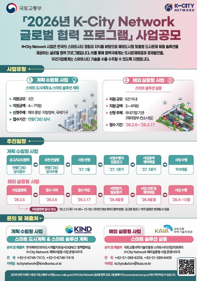 공모와 관련한 자세한 사항은 국토교통부 누리집과 스마트시티 종합포털, K-City 네트워크 누리집을 통해 1월 28일부터 확인할 수 있다.