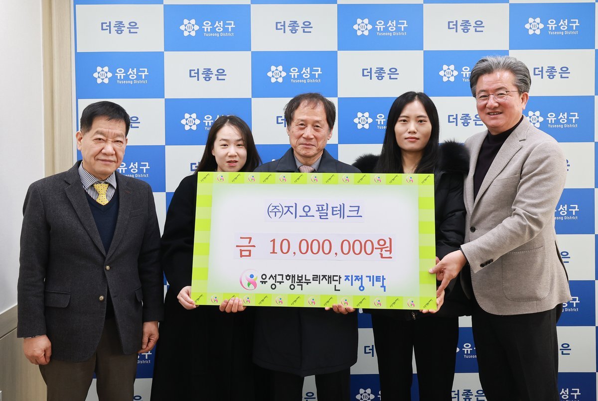 [세종타임즈] 대전 유성구는 28일 ㈜지오필테크가 유성구행복누리재단에 관내 저소득층 지원을 위한 후원금 1,000만 원을 지정 기탁했다고 밝혔다.