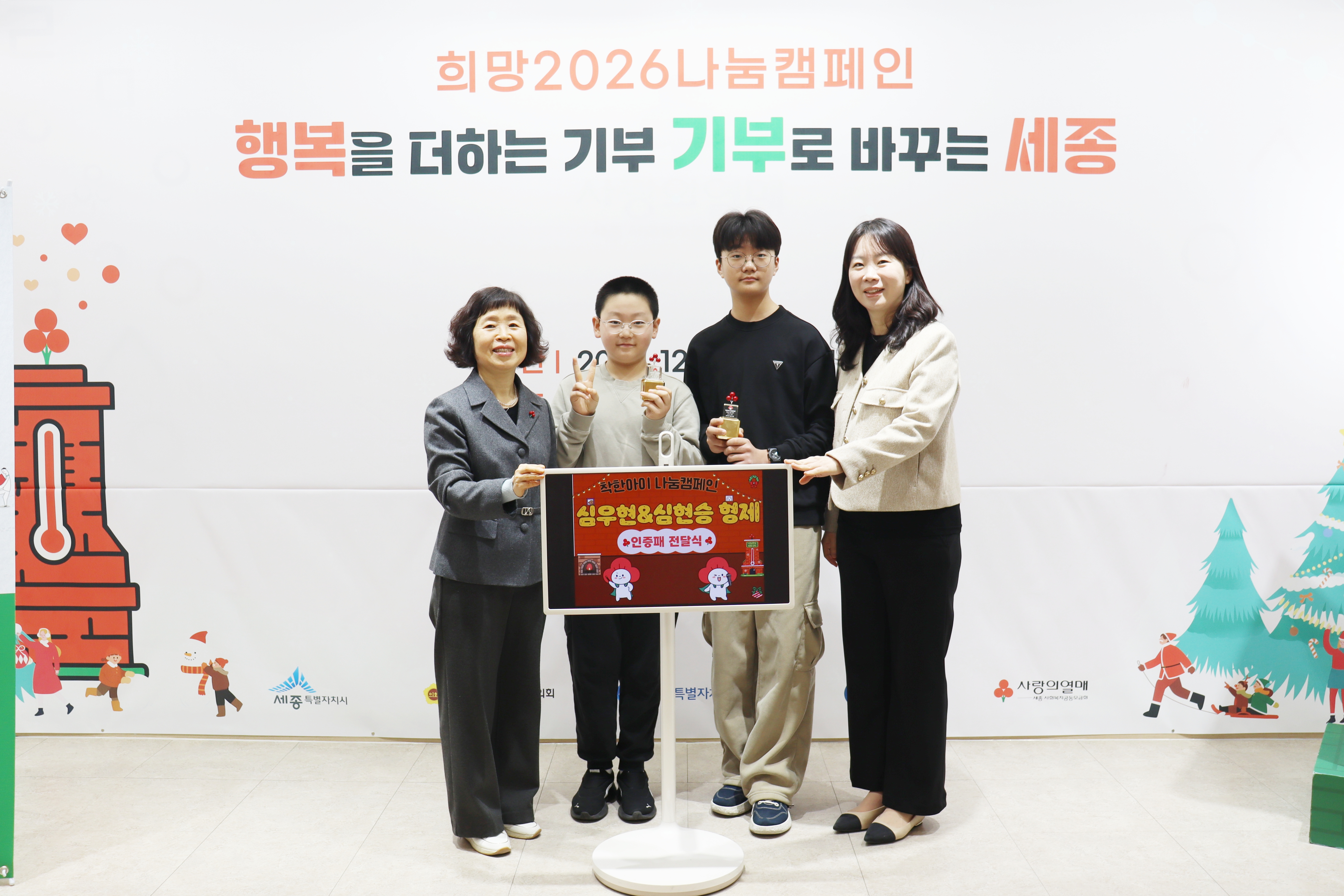 이날 행사에는 심우현(소담중 2학년)·심현승(소담초 6학년) 형제를 비롯해 세종사회서비스원 정책연구부의 한지연 연구위원과 이희정 세종모금회 사무처장 등이 참석해 따뜻한 나눔의 의미를 나눴다.