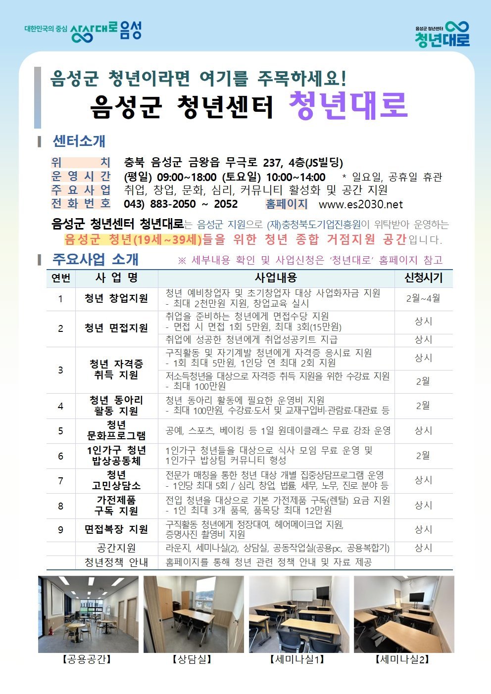 [세종타임즈] 음성군의 청년지원정책 추진 거점공간인 음성군 청년센터 ‘청년대로’는 2월부터 청년지원 프로그램을 본격적으로 운영한다고 밝혔다.