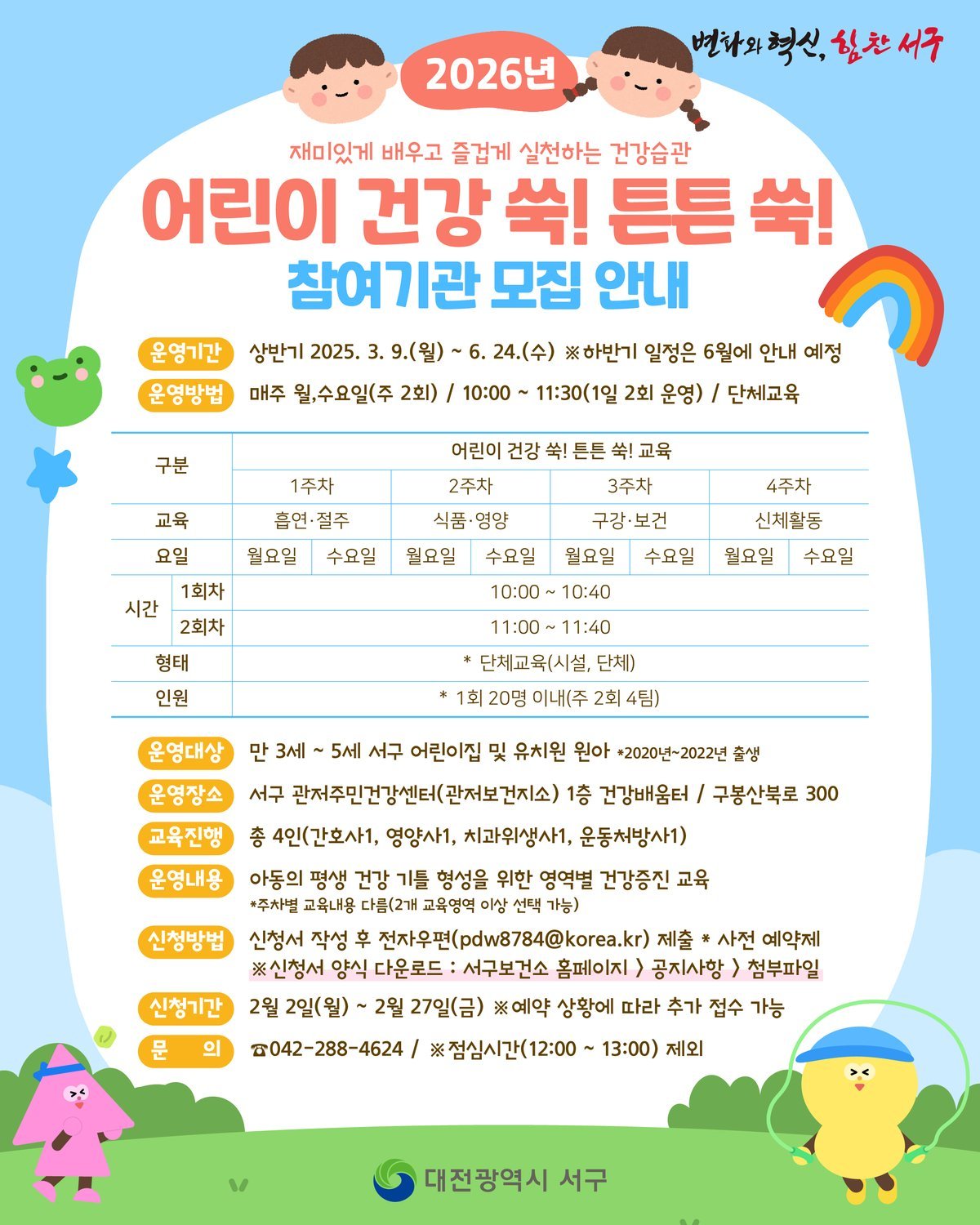 [세종타임즈] 대전 서구는 27일까지 2026년도 어린이 건강증진 프로그램 ‘어린이 건강 쑥 튼튼 쑥’참여 기관을 모집한다.