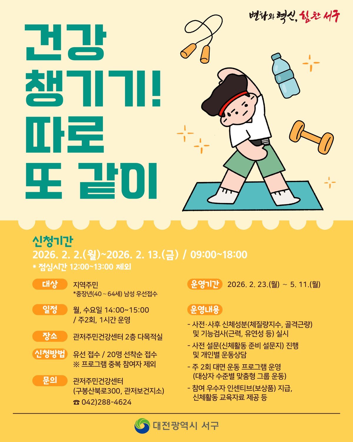 [세종타임즈] 대전 서구 관저주민건강센터는 이달 13일까지 맞춤형 건강 증진 운동 프로그램 ‘건강 챙기기 따로 또 같이’참여자를 모집한다.