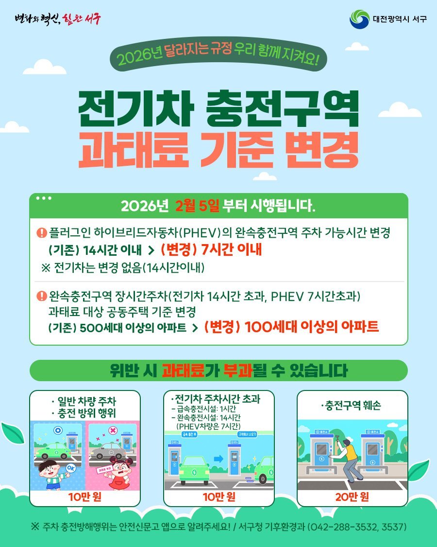 [세종타임즈] 대전 서구는 전기차 충전 질서 확립과 충전 시설 이용 효율 제고를 위해 이달 5일부터 전기차 충전 구역 과태료 부과 기준을 변경 시행한다.
