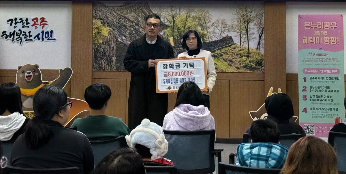 노성자 웅진동장은 “매년 변함없이 지역 학생들을 위해 장학금을 전달해 주시는 부자떡집 심정흠·백아람 대표께 깊은 감사의 마음을 전한다”며 “학생들이 경제적 여건에 관계없이 배움의 기회를 이어가고 자신의 재능을 마음껏 펼칠 수 있도록 행정에서도 지속적인 관심과 지원을 아끼지 않겠다”고 밝혔다.