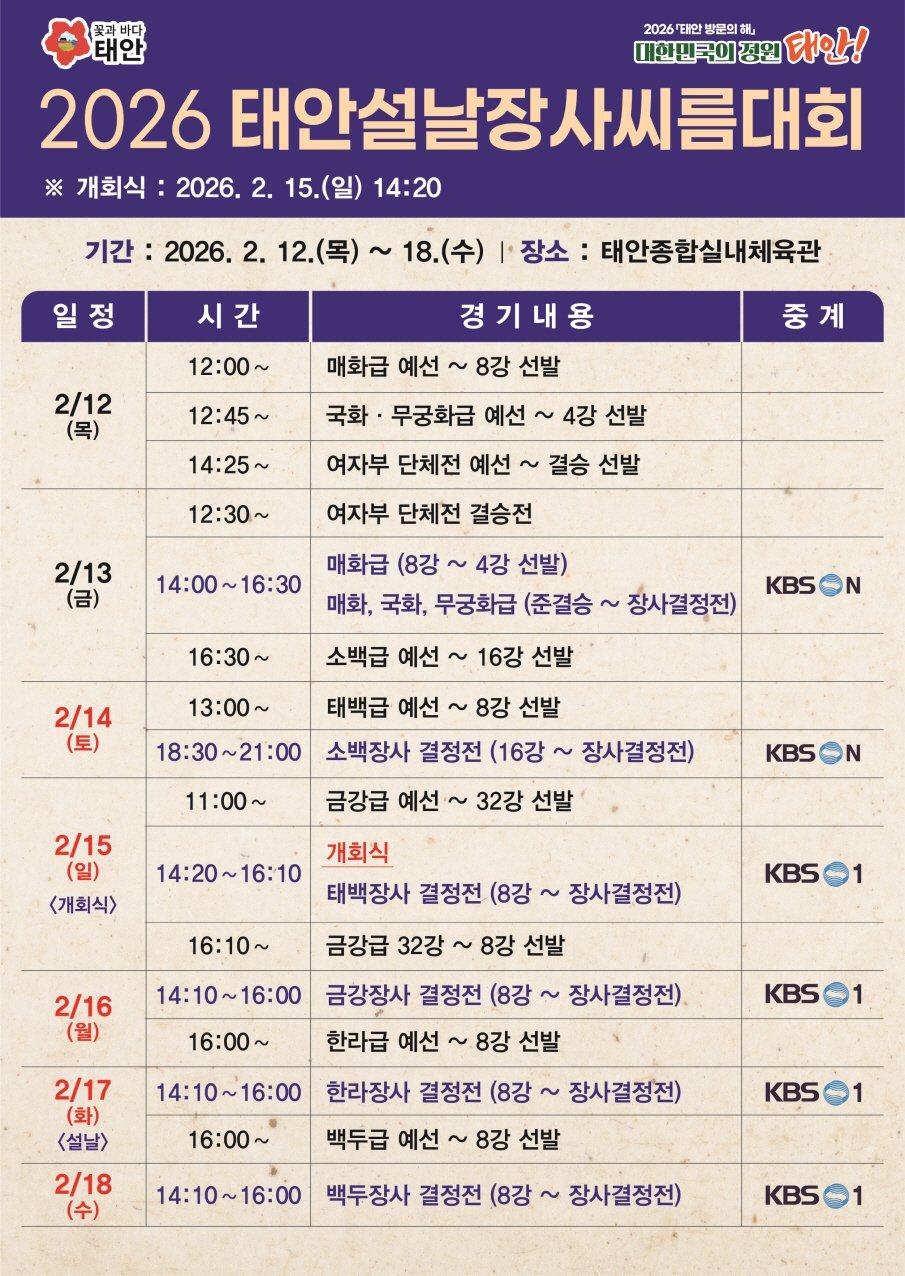 [세종타임즈] 태안군이 민족 대명절 설을 맞아 2월 12일부터 18일까지 태안종합실내체육관에서 ‘위더스제약 2026 태안 설날장사 씨름대회 ’를 개최한다.