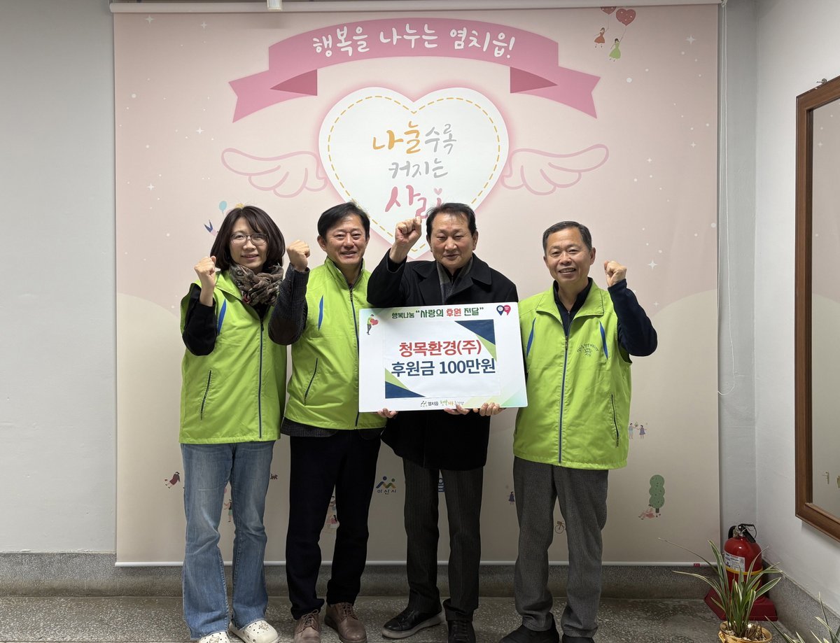 심용근 염치읍장은 "지역의 어려운 이웃들을 위해 꾸준한 관심과 나눔을 실천해 주신 청목환경㈜에 진심으로 감사드린다"며 "앞으로도 행복키움추진단과 함께 민·관 협력을 통해 더욱 촘촘하고 체감도 높은 복지서비스 제공에 최선을 다하겠다"고 전했다.