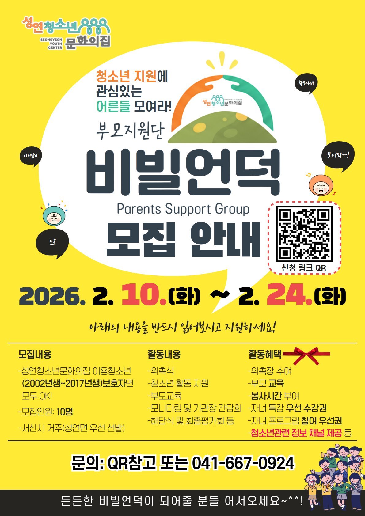 [세종타임즈] 성연청소년문화의집은 2026년 한 해 동안 지역 청소년의 건강한 성장과 안정적인 발달을 지원하기 위해 청소년 보호자를 대상으로 부모지원단 '비빌언덕'참여자를 2월 10일부터 2월 24일까지 모집한다고 밝혔다.