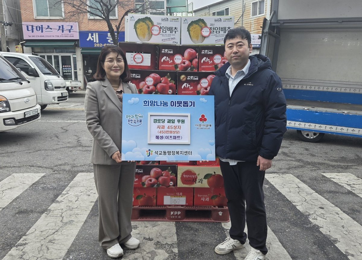 [세종타임즈] 대전 중구 석교동은 9일 관내 이츠마트에서 설 명절을 맞아 어르신들의 건강하고 따뜻한 명절을 기원하며 경로당 10개소에 사과 45박스를 후원했다고 밝혔다.