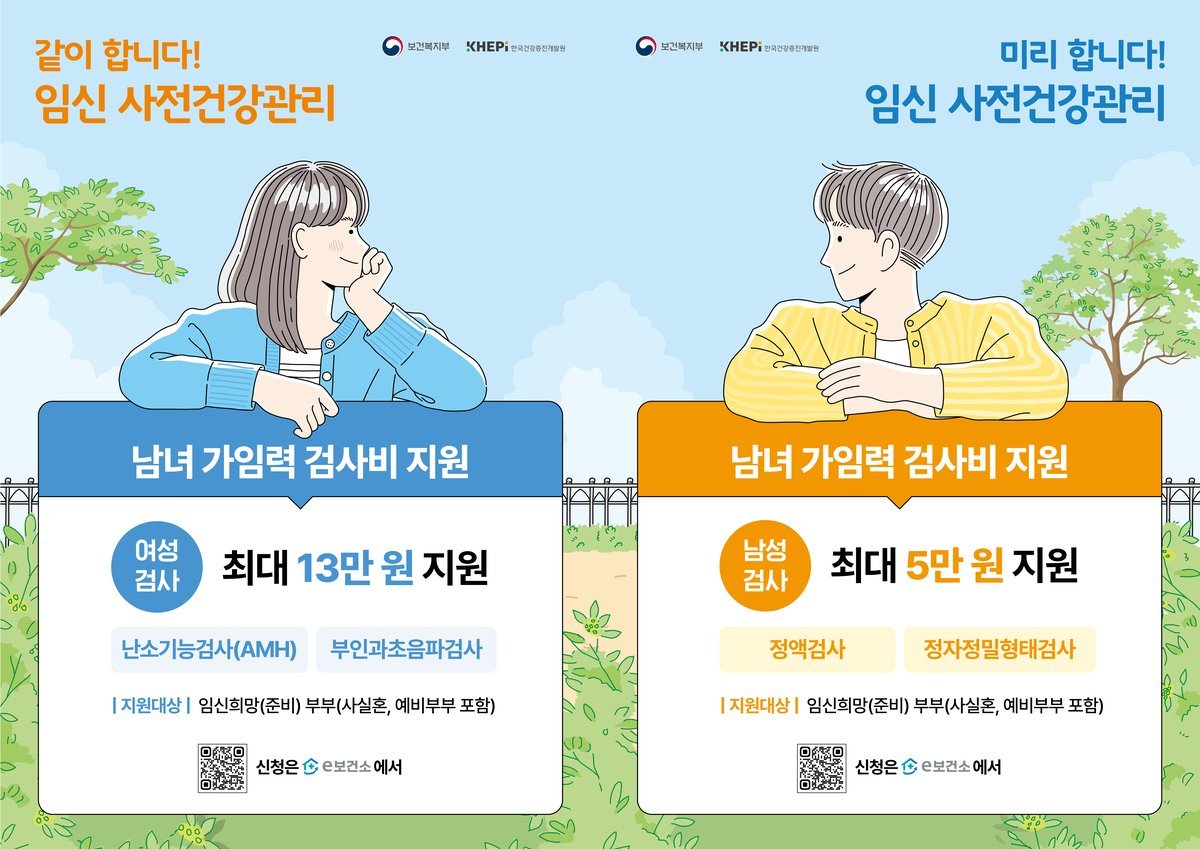 지원 항목은 여성의 경우 난소기능검사와 자궁·난소 질환을 확인하는 부인과 초음파 검사이며 남성은 정자정밀형태 검사이다.