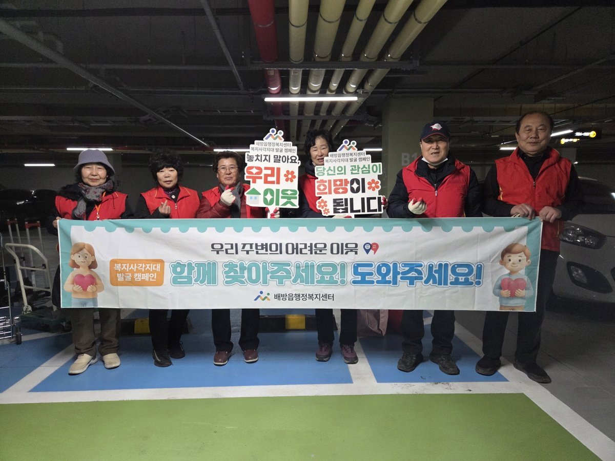 이번 캠페인은 동절기를 맞아 주거·생계 등 복지 위기에 처한 가구를 선제적으로 발굴하고 지역 주민의 복지 인식을 높이기 위해 마련됐으며 배방읍 찾아가는 보건복지팀과 행복키움추진단 등 20여명이 참여했다.