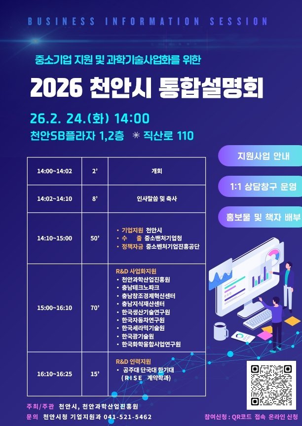 [세종타임즈] 천안시는 오는 24일 천안과학산업진흥원과 함께 천안SB플라자에서 ‘중소기업 지원 및 과학기술사업화를 위한 2026 천안시 통합설명회’를 개최한다고 11일 밝혔다.