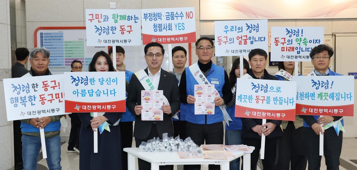 이번 캠페인은 박희조 동구청장을 비롯해 감사실과 대전동구공무원노동조합이 함께한 가운데, 명절 전후 자칫 느슨해질 수 있는 공직자의 청렴 의식을 강조하고 투명한 공직사회 분위기를 조성하기 위해 추진됐다.