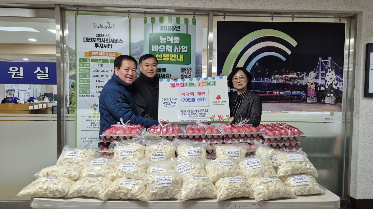 [세종타임즈] 대전 중구 은행선화동은 지난 10일 은행선화동 바르게살기위원회에서 관내 어려운 이웃을 위해 떡국떡 60kg과 계란 30판을 기탁했다고 밝혔다.