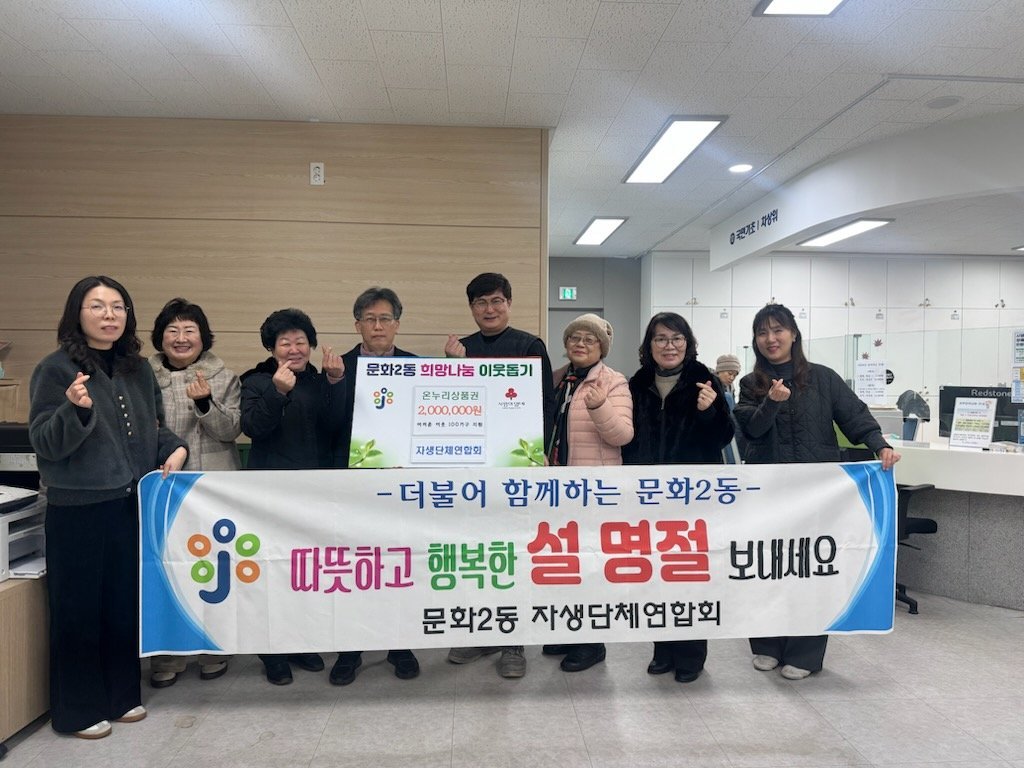 한편 문화2동 자생단체연합회는 매년 설 명절마다 꾸준히 관내 어려운 이웃을 위한 온누리상품권 기탁을 이어오며 지역사회 나눔을 실천하고 있다.