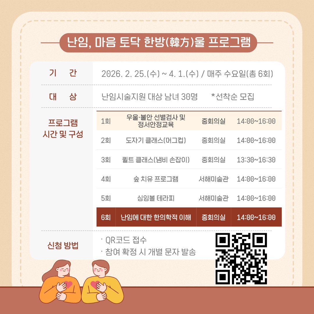 주요 내용은 △ 난임 우울·불안 선별검사 △ 마음을 돌보는 정서 안정 교육 △ 도자기 만들기, 싱잉볼 테라피 등 힐링 프로그램 △ 난임에 대한 한의학 이해 △ 만족도 조사 및 모니터링 등이다.