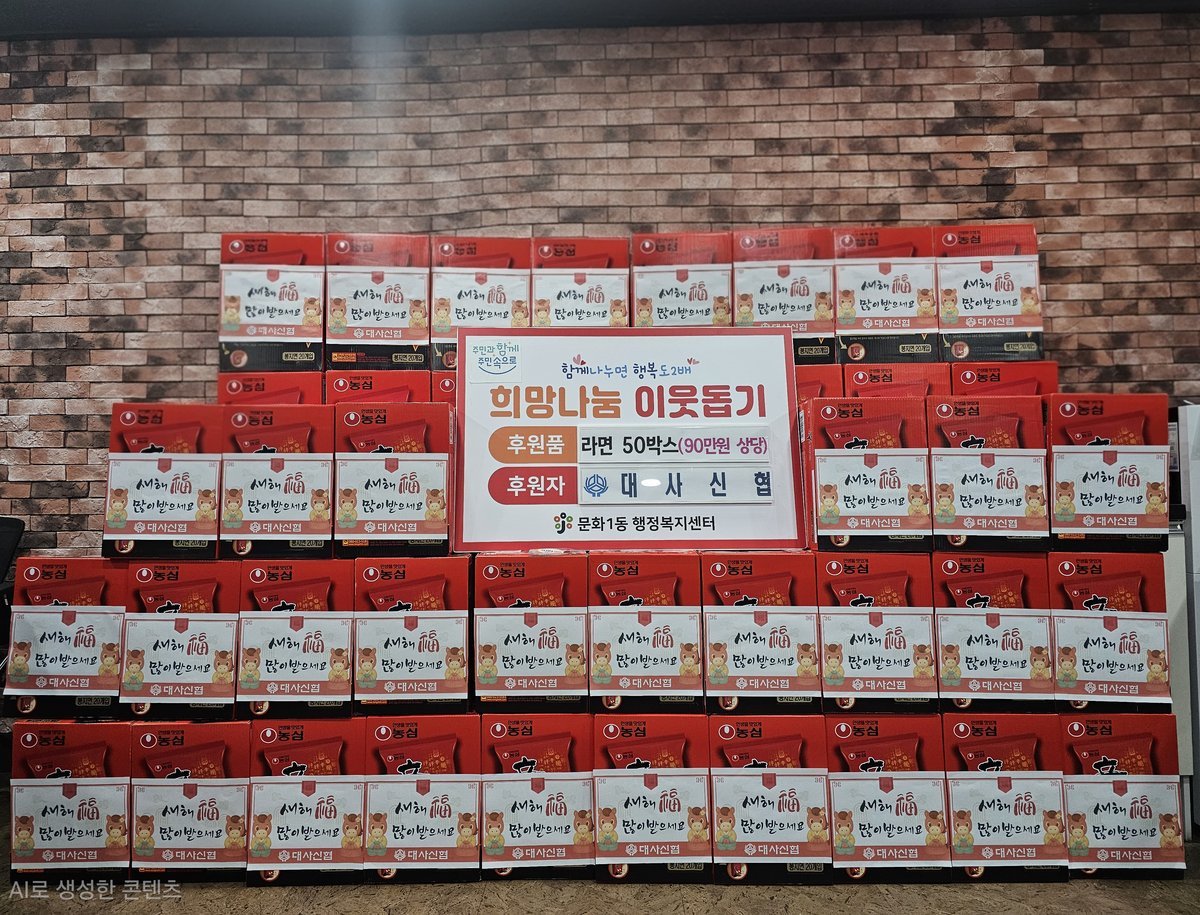 대사신협은 매년 명절마다 꾸준히 후원을 이어오며 지역사회 나눔문화 확산에 앞장서고 있으며 이번에 기탁된 라면은 경제적 어려움을 겪고 있는 저소득 가정 및 취약계층에 전달되어 따뜻한 설 명절 분위기를 전하는 데 큰 도움이 될 것으로 기대된다.