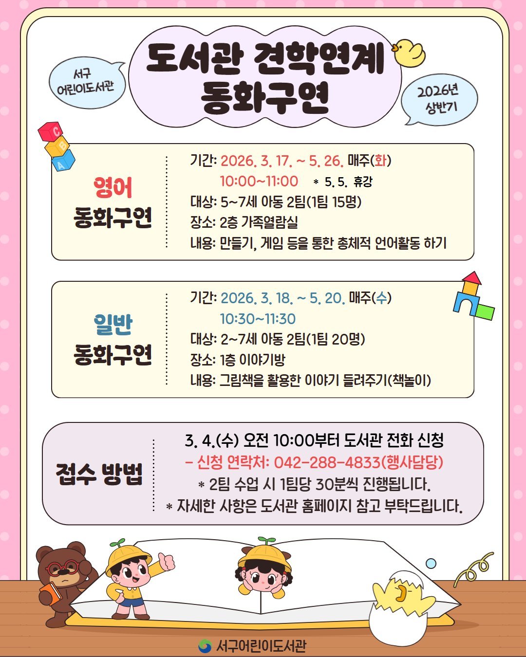 수업은 3월 17일부터 5월 26일까지 매주 화요일과 수요일 총 20회차로 진행되며 일반 동화구연과 영어 동화구연으로 나눠 운영된다.