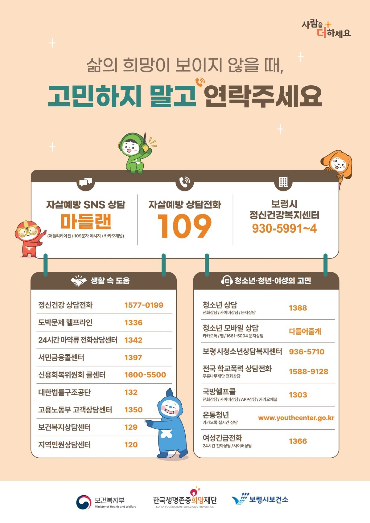 또한 △보건지소·진료소 전광판 활용 자살예방 문구 송출 △관내 16개 행정복지센터에 자살예방 상담 서비스 안내 현수막 게시 △보령종합터미널 등 다중이용시설 5개소에 자살예방 홍보 영상 송출 △만세보령소식지, 보건소 누리집에 도움기관 정보 게시 등 다양한 홍보 활동도 병행한다.