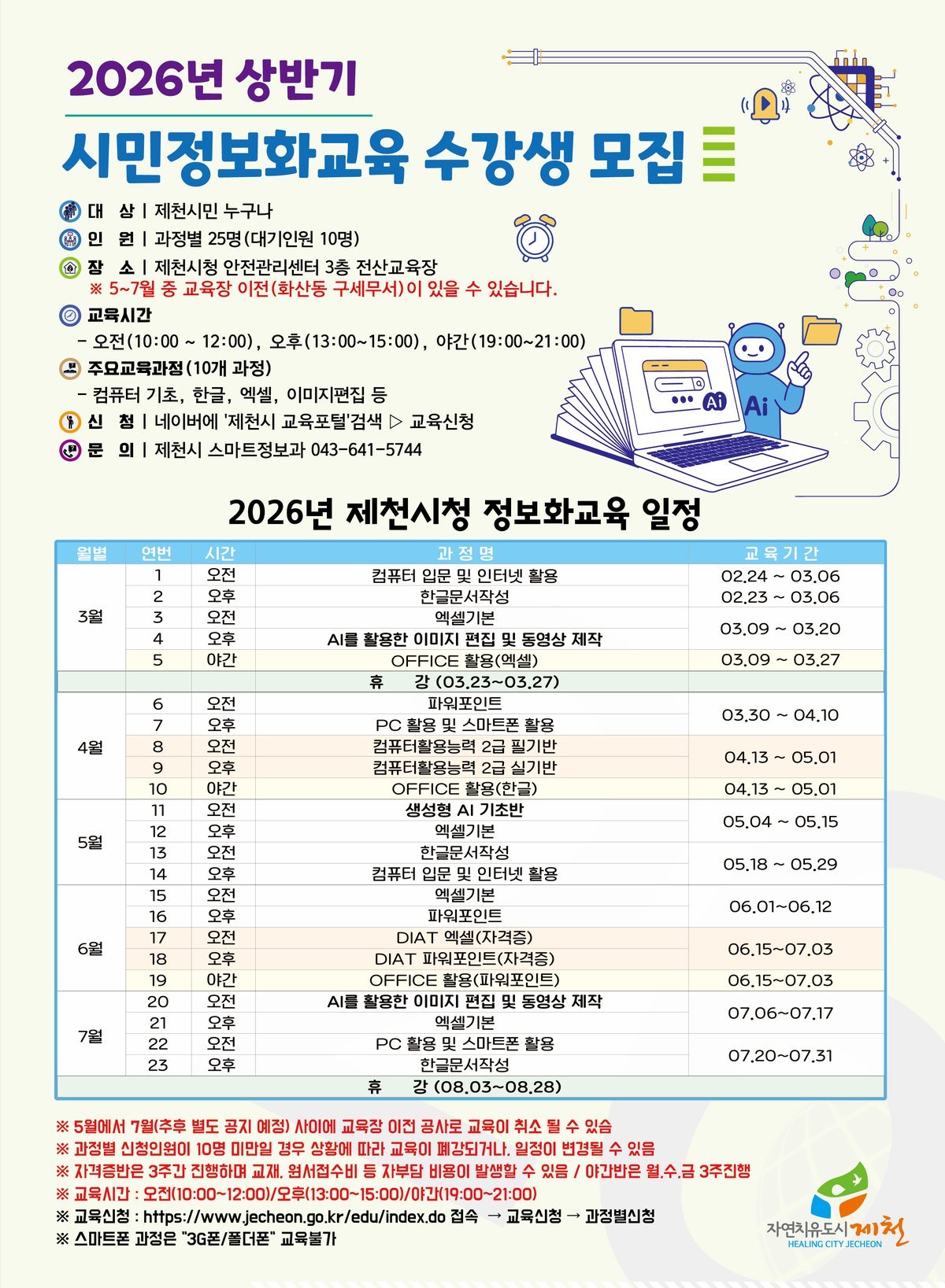 [세종타임즈] 제천시는 시민들의 디지털 정보격차 해소와 미래 역량 강화를 위해 ‘2026년 시민 정보화교육’전 과정을 무료로 운영한다고 밝혔다.