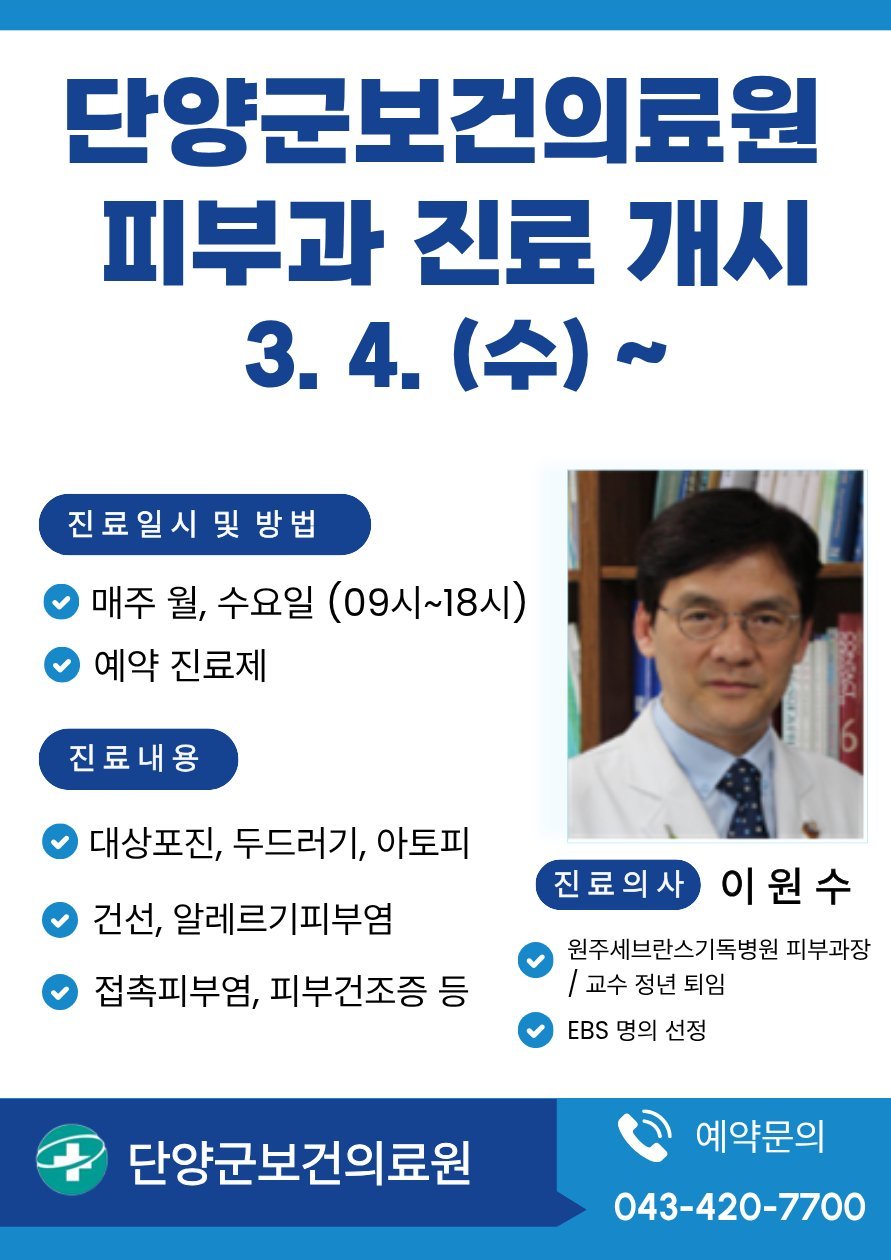[세종타임즈] 단양군보건의료원이 지역 주민의 피부 건강 증진을 위해 피부과 전문 진료실을 개설하고 오는 3월 4일부터 본격적인 진료를 시작한다.