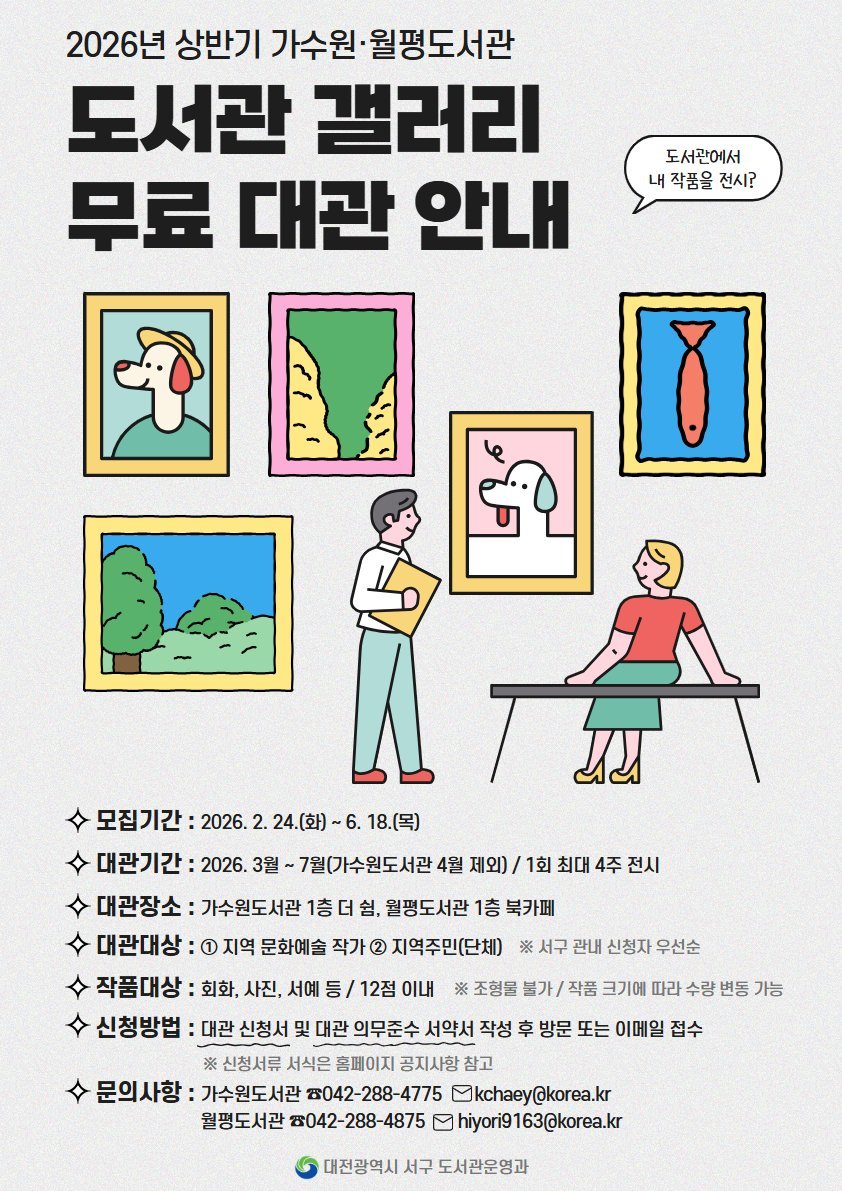 서구에서 활동하는 작가 및 구민은 누구나 신청할 수 있으며 전시 공간은 가수원도서관 1층 ‘더쉼’과 월평도서관 1층 북카페 내에 마련된다.